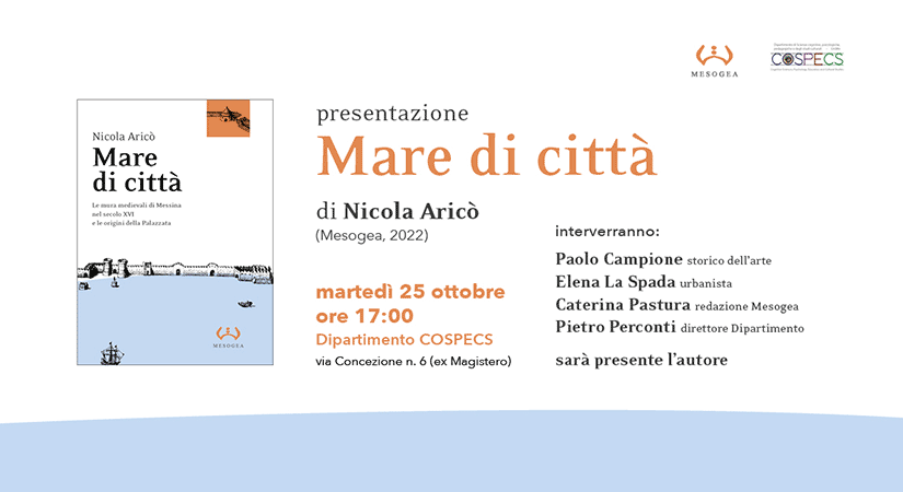 Vi invitiamo alla presentazione di «Mare di città. Le mura medievali di Messina nel secolo XVI e le origini della Palazzata» di Nicola Aricò che si svolgerà martedì 25 ottobre ore 17.00 presso il Dipartimento COSPECS, in via Concezione n.6 (ex Magistero), Messina.